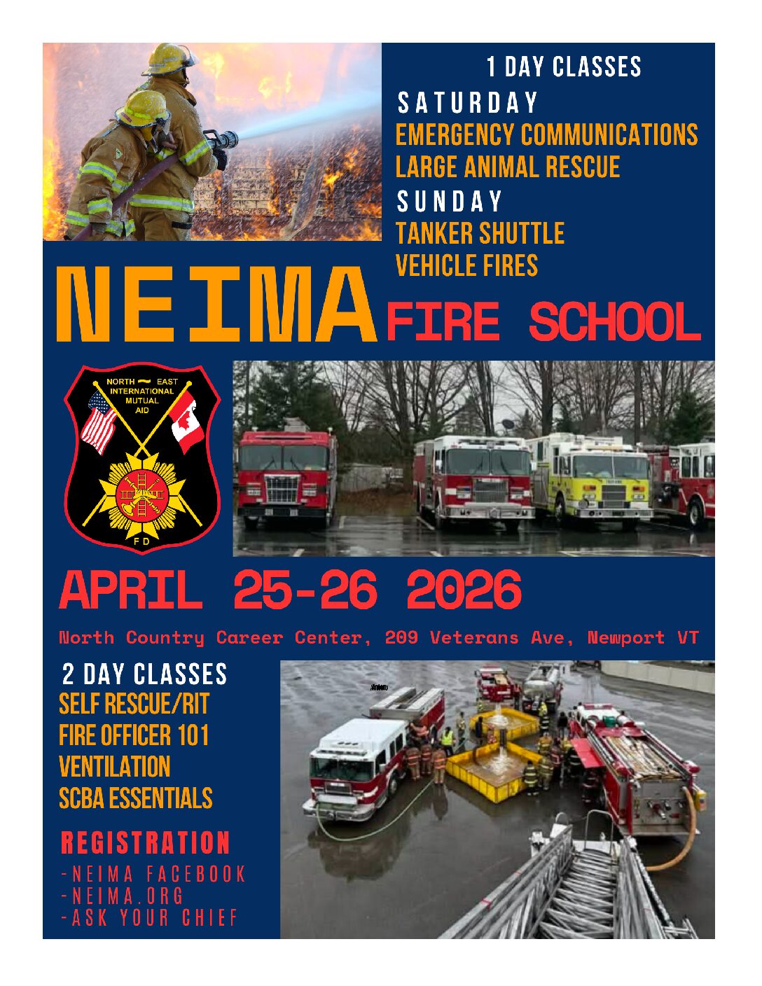 North East International Mutual Aid (NEIMA) will be holding our Annual Regional Fire School at the North Country Career Center on the weekend of April 25th – 26th. Registration for classes offered at the NEIMA Regional Fire School is now open. The following classes are being offered this year: