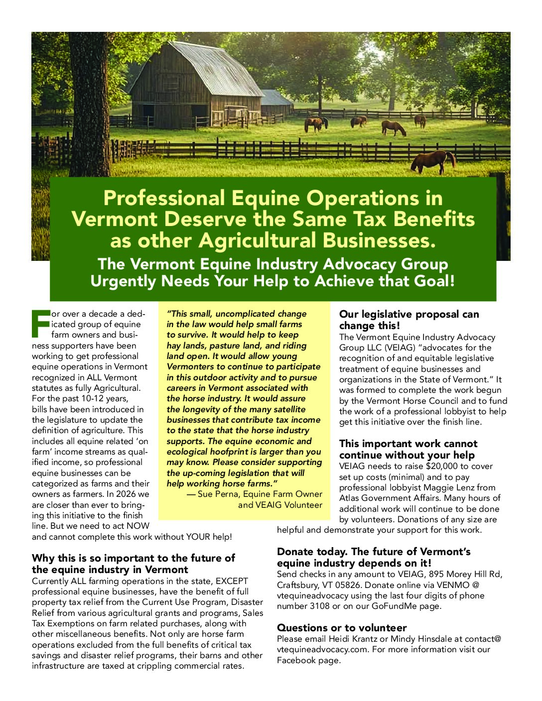 The Vermont Horse Council has been an advocate for the equine industry in Vermont since 1975